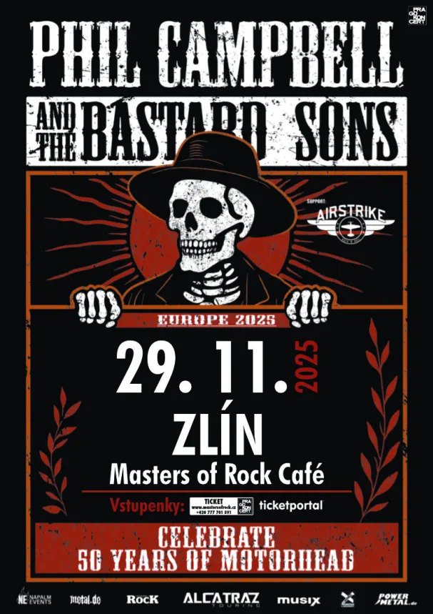 Toto není jen další turné – je to pocta legendárnímu odkazu Lemmyho Kilmistera a oslava nadčasové síly, kterou Motörhead je. Zapište si do kalendářů: PHIL CAMPBELL AND THE BASTARD SONS dorazí na tomto vzpomínkovém turné na jediný koncert i k nám, do ZLÍNA, Masters of Rock Café, 29. listopadu 2025!