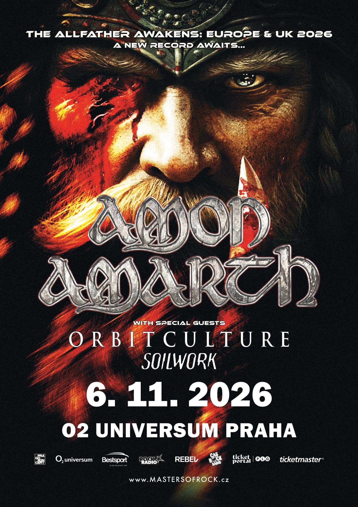 AMON AMARTH se zbrusu novým hudebním masakrem naplánovali na podzim Evropské turné s názvem „The Allfather Awakens: Europe & UK Tour 2026“ a tato vlna smete 6. listopadu 2026 i PRAHU, O2 universum! Na cestu s sebou berou jednu z nejdiskutovanějších a nejúspěšnějších moderních metalových kapel současnosti, Švédy ORBIT CULTURE, kteří vám představí svoji nejnovější desku „Death Above Life“ (2025) a známé, oblíbené a vždy dokonale autentické Švédy SOILWORK!