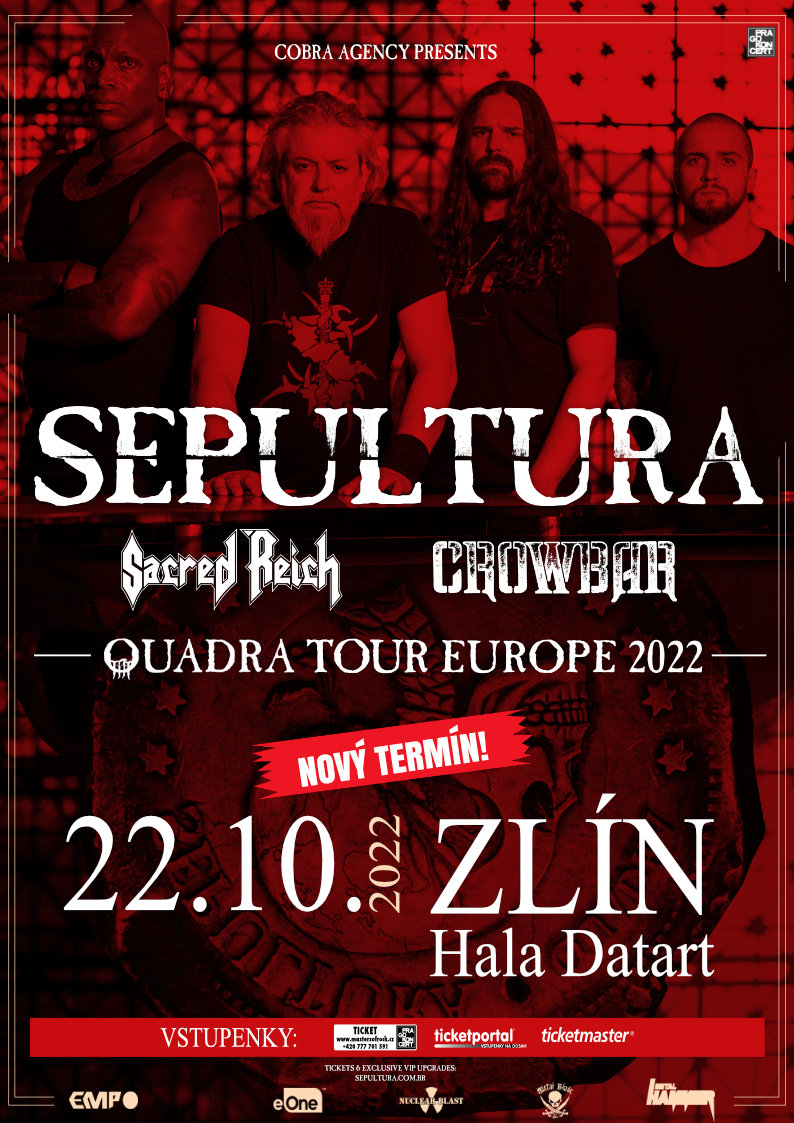 Brazilští thrash metaloví hrdinové SEPULTURA bohužel musí z důvodů nám všem jasných a známých odložit své dlouho plánované turné po Evropě se svou letošní novinkou a velmi povedenou deskou „Quadra“. Turné se naštěstí podařilo přeložit na podzim 2022! Jedna zastávka tohoto turné stále patří České republice a ZLÍNU!