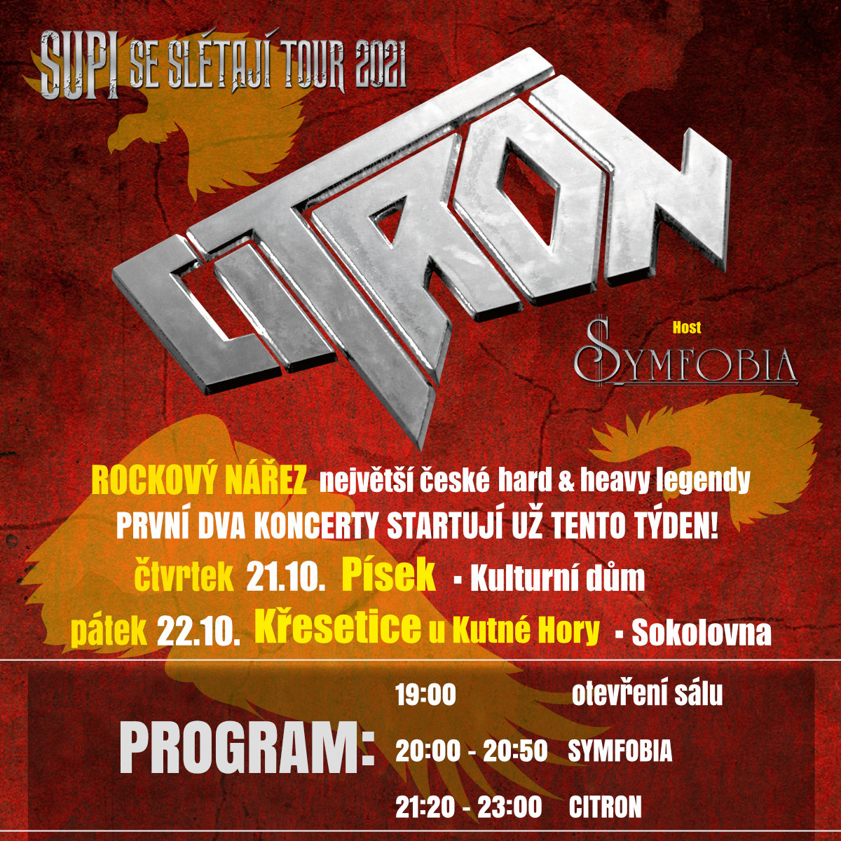 Už je to tady! Dlouho očekávané a plánované turné největší české hard & heavy legendy CITRON „Supi se slétají 2021“ začíná! Už ve čtvrtek 21.10. se na vás CITRONi a jejich speciální host, slovenská kapela SYMFOBIA, těší v PÍSKU v kulturním domě a hned den poté, v pátek 22.10. v Sokolovně v KŘESETICÍCH u KUTNÉ HORY!