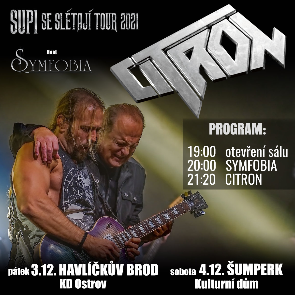 Tak je to tu, česká hard & heavy legenda CITRON úspěšně dotahuje do konce své dlouho plánované, 2x přesouvané turné „Supi se slétají“, které se nakonec přes všechny potíže a zákazy podařilo tento podzim odjet, a to bez jediného zrušeného koncertu! V dnešní době je to jako malý zázrak. CITRON mají za sebou opravdu těžký rok, a tak jsme rádi, že se turné nakonec uskutečnilo a hlavně, že u vás, fanoušků, zaznamenalo opravdu veliký ohlas. Před námi jsou poslední 2 koncerty turné! Už zítra, v pátek 3.12. zavítají CITRON do Kulturního domu Ostrov v HAVLÍČKOVĚ BRODU a poslední koncert turné patří ŠUMPERKU, kde probudí k životu rovněž místní kulturní dům. Přijďte, máte poslední příležitost užít si ještě letos live koncert, navíc koncert této stálice domácí hudební scény. Zábavy a odreagování není nikdy dost, a v této době dvojnásob! Po nemoci do turné zpátky naskakuje také speciální host turné, vynikající slovenská symphonic metalová kapela SYMFOBIA a chybět nebude ani violoncellové duo! Všichni už se na vás moc těší! Novinkou je, že vás tentokrát ani nebudou bolet nohy, protože oba koncerty budou a sezení!