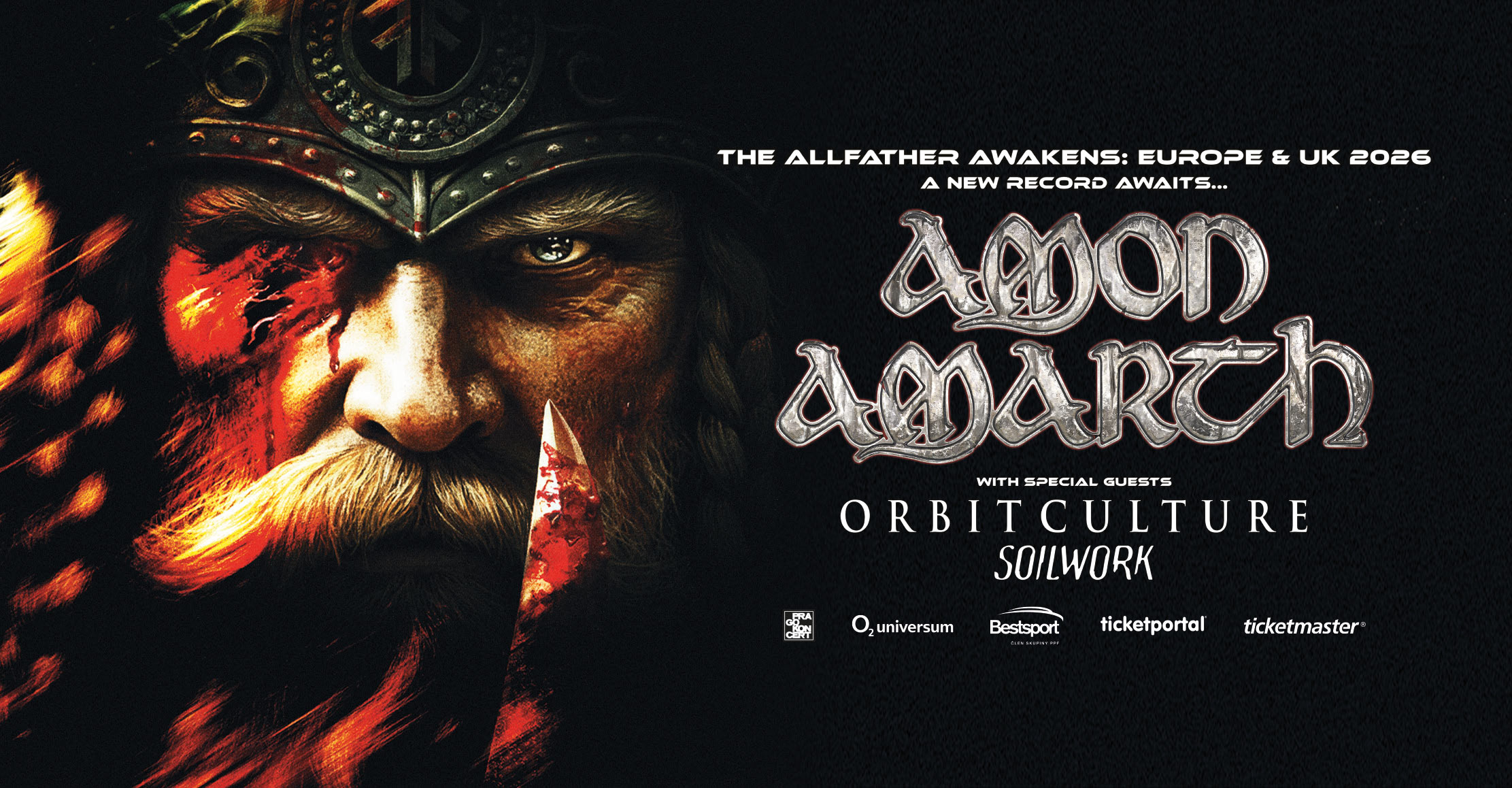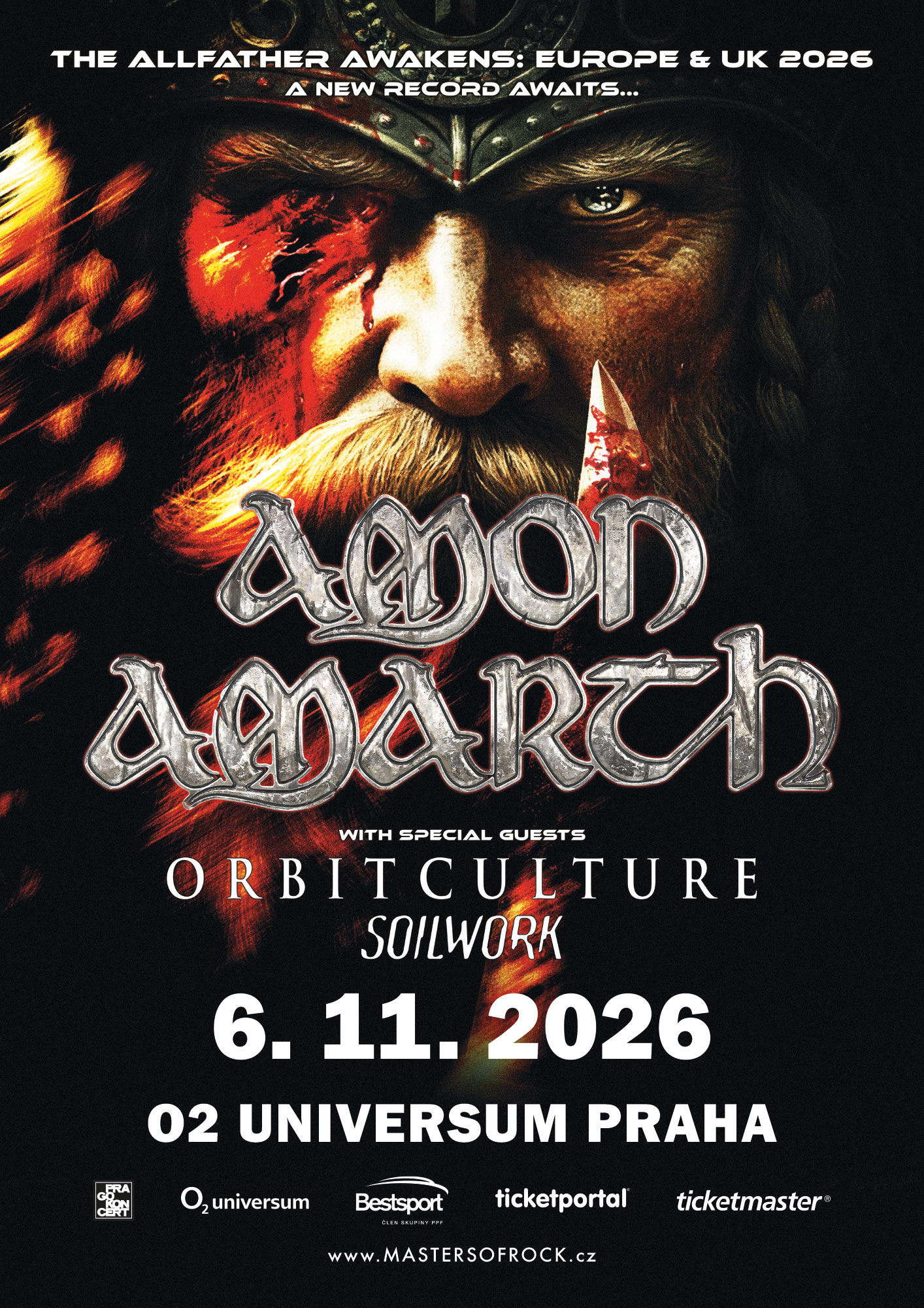 AMON AMARTH se zbrusu novým hudebním masakrem naplánovali na podzim Evropské turné s názvem „The Allfather Awakens: Europe & UK Tour 2026“ a tato vlna smete 6. listopadu 2026 i PRAHU, O2 universum! Na cestu s sebou berou jednu z nejdiskutovanějších a nejúspěšnějších moderních metalových kapel současnosti, Švédy ORBIT CULTURE, kteří vám představí svoji nejnovější desku „Death Above Life“ (2025) a známé, oblíbené a vždy dokonale autentické Švédy SOILWORK!
