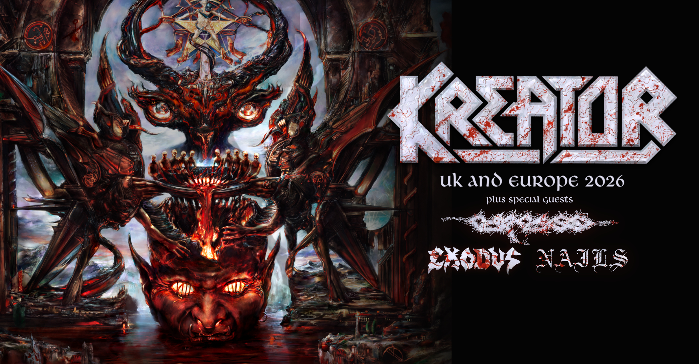 Legendární KREATOR oznámili název svého nového, již šestnáctého studiového alba „KRUSHERS OF THE WORLD“ (vyjde 16. ledna 2026) a připojili rovnou trasu, kudy povedou jejich kroky s tímto novým albem! Do pražského Fóra Karlín dorazí KREATOR se svými mocnými hosty, CARCASS, EXODUS a NAILS, 12. dubna 2026!