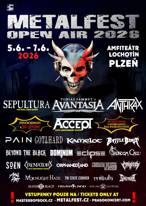 ACCEPT – 50th Anniversary show – německá heavymetalové legenda ACCEPT oslaví na METALFESTU 2026 své fantastické, 50. výročí! U příležitosti tohoto svého obrovského milníku, kapela oslaví své zlaté narozeniny nejen zcela unikátním výročním turné s velmi pečlivě vybranými městy, ale i výročním albem, které vyjde začátkem roku 2026! ACCEPT úspěšně formovali celé generace metalových hudebníků i fanoušků a se svým nezaměnitelným zvukem patří do metalové síně slávy! Na METALFESTU v PLZNI vás čeká fantastická metalová cesta časem v dechberoucí pódiové show. Zazní všechny největší hity a heavy-metalové klasiky i ty skladby, které byly hrávány naživo vzácně, nebo téměř nikdy! A možná se zde objeví i překvapiví hosté…