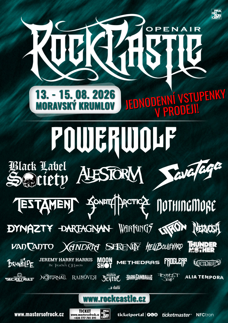 Fantasticky pohodový mezinárodní rock-metalový festival ROCK CASTLE, který se v půlce srpna 2026 uskuteční v zámeckém parku v MORAVSKÉM KRUMLOVĚ už pošesté, odhalil první potvrzené kapely a odstartoval prodej první, limitované várky festivalových permanentek za super zaváděcí cenu, platnou do konce října, nebo do vyprodání této první emise vstupenek!
